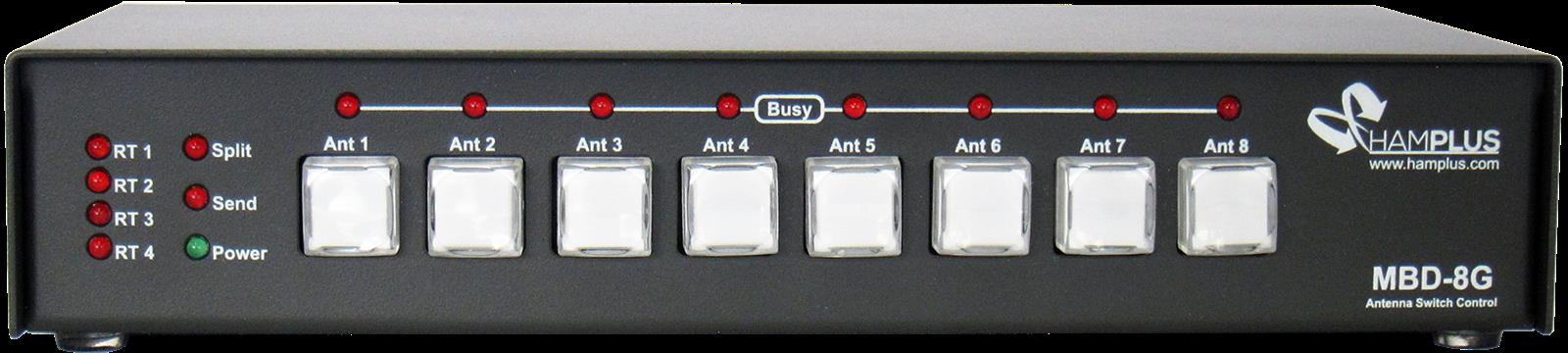 Hamplus MBD-8G Automatic Antenna Switch Controllers are memory band and frequency decoding automatic antenna switch consoles that are compatible with all Hamplus eight input antenna switch relay units. They can be operated manually and are easily connected to function integrally with the transceiver. Each interfaced MBD-8G smart controller is simply memorized initial manual antenna selection on the front panel. Transceiver frequency and band changes then automate the correct antenna selection by band or band segment. Band data and frequency information is sampled from the transceiver CI-V, CAT or RS-232 as it is sent to the computer. These controllers also support split antenna selections for receive and transmit with automatic changeover supported by input and output connectors for the transceiver amplifier keying line. An interlock system safeguards against hot-switching and protects the radio and antenna systems from RF damage.